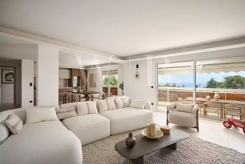 Situé au dernier étage d'une luxueuse résidence construite en 1994 avec parc, gardien et piscine, splendide appartement 5 pièces de 135,55 m² s'ouvrant sur une terrasse d'angle de 32 m² et bénéficiant d'une vue sur la mer, la verdure et les îles de Lérins.