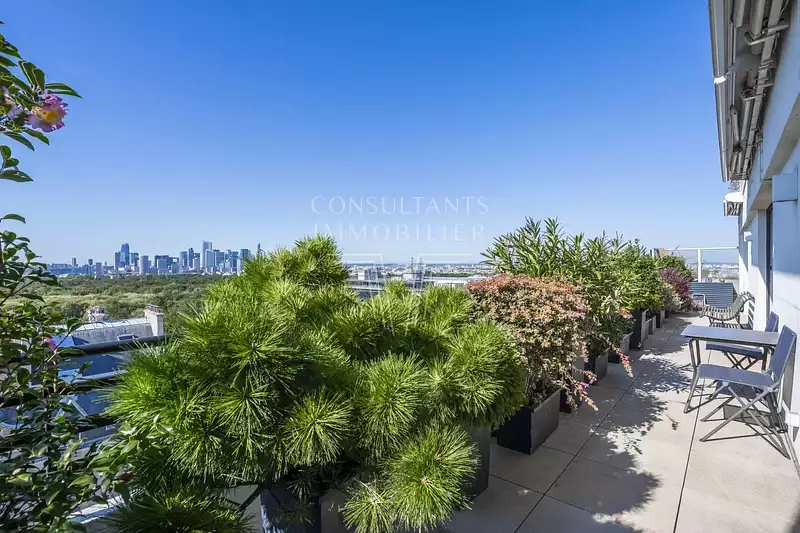 Splendide appartement traversant est et ouest en excellent état, à la fois familial et de réception, bénéficiant d’une terrasse de 32 m² à la vue extraordinaire sur Paris, le bois, La Défense et la Tour Eiffel. D’une superficie de 139,07 m² loi Carrez parfaitement répartis, cet appartement a été entièrement rénové par un décorateur et donne de plain-pied sur la sublime terrasse.