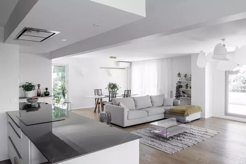 Spacieux séjour de 61 m² baigné de lumière, ouvert sur trois terrasses (22 m², 26 m² et 7 m²) offrant de véritables espaces extérieurs à vivre ;