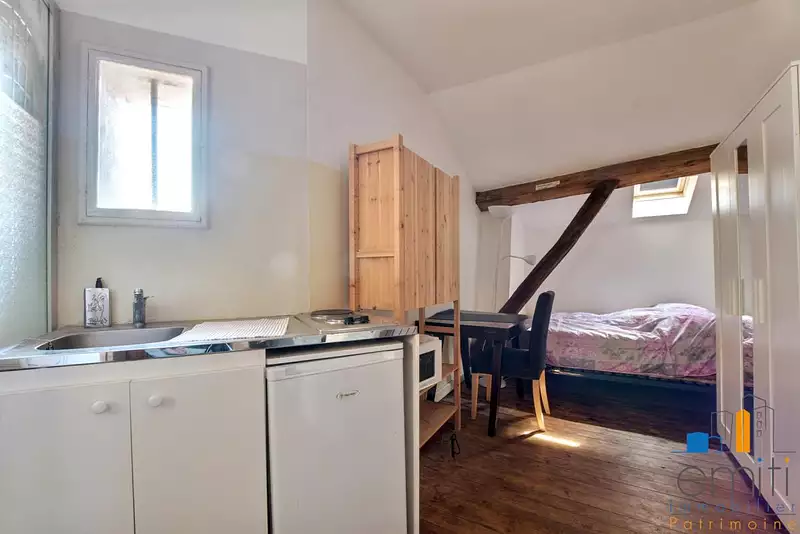 Charmant studio de 13,6 m² situé dans un quartier recherché. Il dispose également d'un grenier, offrant un espace de rangement supplémentaire.