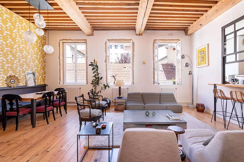 En plein coeur de la Croix-Rousse, sur la rue du Mail, cet appartement s'apparente à une véritable maison de ville. Il développe 148 m² utiles (125 m² Carrez) répartis sur trois niveaux, au calme absolu : Niveau 1 : trois chambres avec rangements, salle d'eau. Niveau 2 : un vaste séjour lumineux avec vue dégagée, cuisine semi-ouverte et nombreux rangements. Dernier niveau : une suite parentale Le tout dans un cocon mêlant le cachet de l'ancien et une rénovation contemporaine, à deux pas de l'animation du quartier. Une cave complète le bien. Un stationnement est disponible en sus. Copropriété de 8 lots (Pas de procédure en cours). Charges annuelles : 1376 euros.