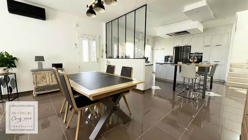 Dès le pas de la porte, un sas d’entrée élégant vous guide vers une pièce de vie spectaculaire de 62 m2, baignée de lumière. Deux grandes baies vitrées en triple vitrage anti-UV, un salon cosy, une salle à manger ouverte, une cuisine aménagée et équipée haut de gamme… chaque détail a été pensé avec soin pour conjuguer esthétique et fonctionnalité. De part et d’autre, un accès direct à une cour privée paysagée, intime et sans vis-à-vis. Un garage attenant et une place de stationnement privative complètent les prestations extérieures.