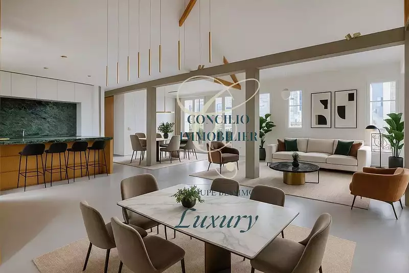 Occupant les 5ᵉ et 6ᵉ étages d’un immeuble de standing, ce bien d’exception développe une superficie de 150,49 m² Loi Carrez et 196 m² au sol. Il s’ouvre sur un séjour cathédrale spectaculaire, baigné de lumière naturelle, sublimé par une cuisine contemporaine avec îlot central, pensée pour des moments de convivialité raffinée.