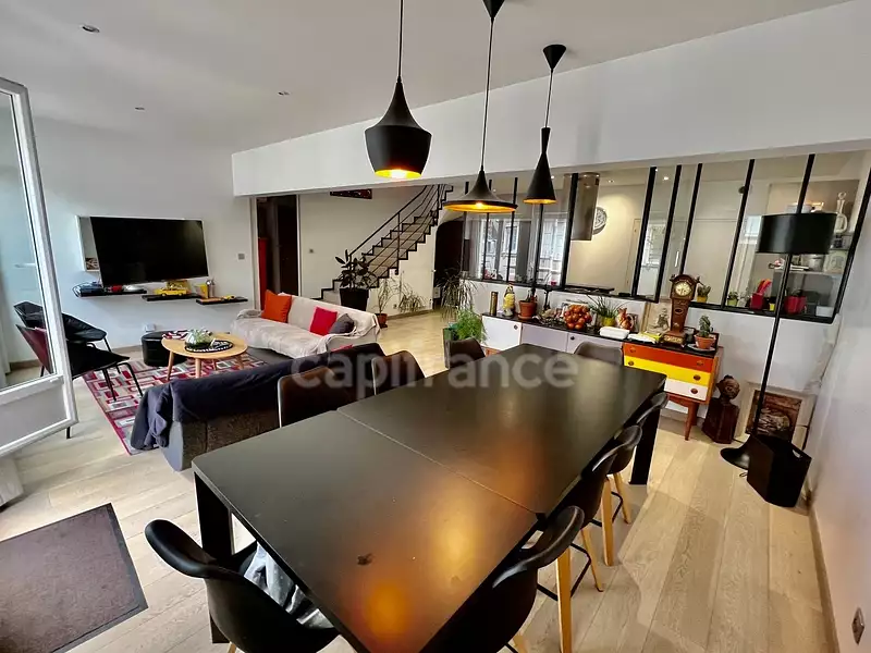 La cuisine semi-ouverte de par sa verrière esprit loft, est équipée et aménagée avec coin repas qui s'ajoute à la partie salle à manger.
