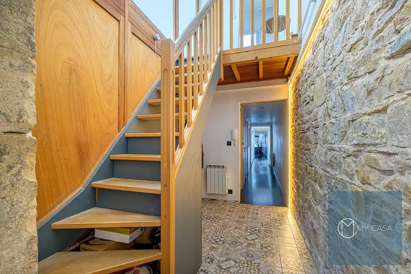 Mur en pierres apparentes dans l’entrée, apportant authenticité et caractère