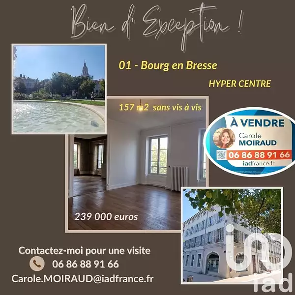 iad France - Carole Moiraud vous propose: EXCEPTIONNEL – Appartement de charme 5 pièces avec potentiel pour T1 indépendant ou colocation – Hyper centre Bourg-en-Bresse