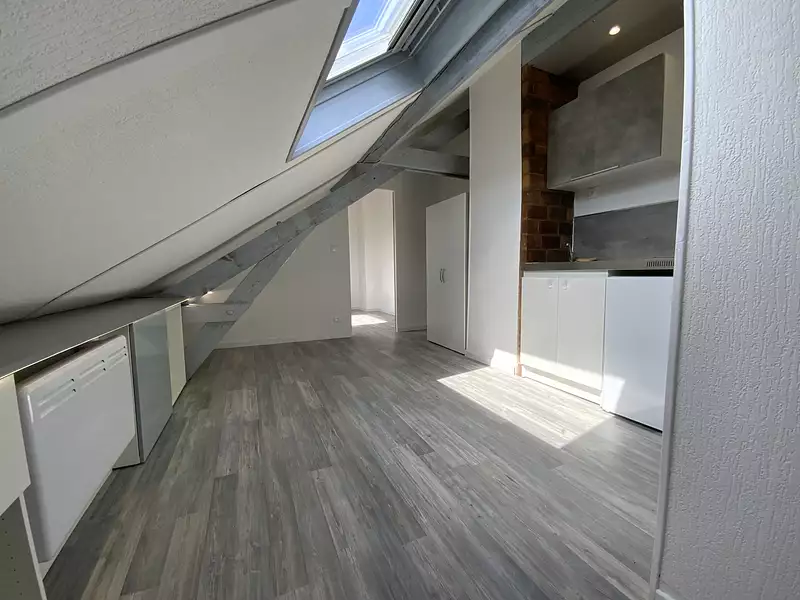 Appartement aménagé dans les combles au 2ème étage d'une résidence en copropriété. d'une surface habitable de 15,2 m2 pour une surface au sol de près de 32 m2 se composant d'un séjour avec coin cuisine équipé d'un réfrigérateur, d'une plaque électrique 2 feux, d'une chambre et d'une salle d'eau avec douche, sèche serviette électrique et WC.