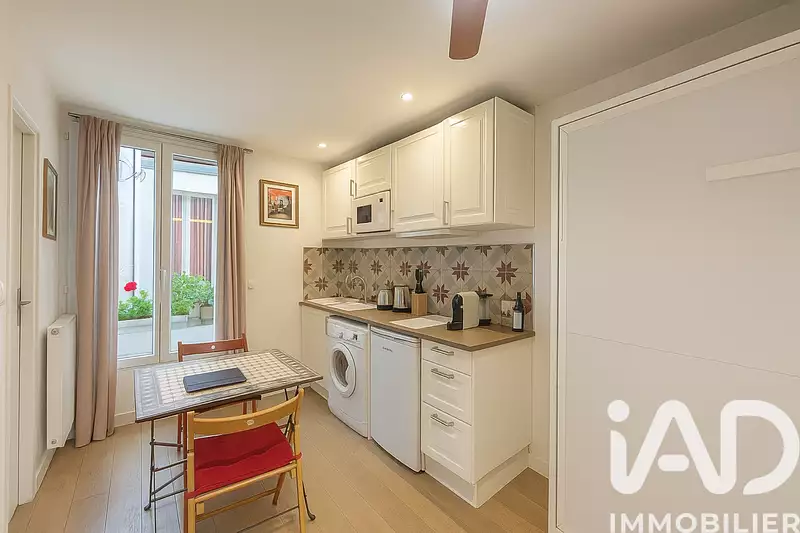 un studio élégant, situé au 1er étage, tourné vers une cour intérieure préservée, offrant une atmosphère paisible au cOEur du quartier le plus iconique de Paris.