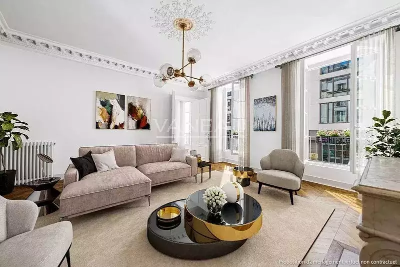 Nous avons le plaisir de vous présenter un appartement familial et de réception de six pièces, d'une superficie de 157,08 m² loi Carrez, situé au premier étage avec ascenseur d'un immeuble bien entretenu édifié en 1850.