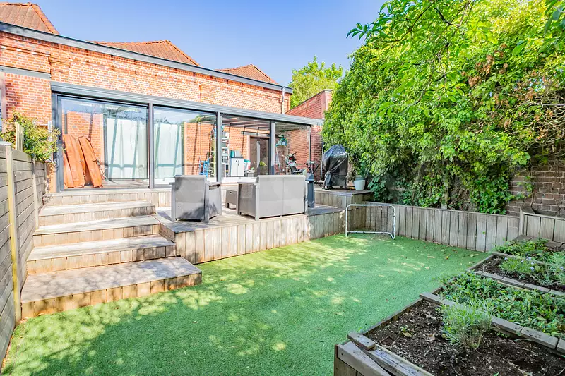 La véranda, qui fait partie intégrante de la loi Carrez, est en aluminium et double vitrage. Une structure en bois la ramène au même niveau que le loft. Cette hauteur aura permis d’encastrer le grand couloir de nage. L’eau peut être chauffée et il dispose de son propre système d’évacuation. On trouve également une douche d’extérieur. Deux grandes baies vitrées permet d’accéder au jardin composé d’une grande partie terrasse et en contrebas un jardinet.