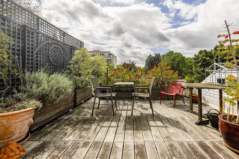 L'appartement se compose d'un palier, d'une cuisine dinatoire, de trois chambres (21, 17 et 9 m² avec possibilité d'agrandissement), d'une salle d'eau avec toilettes, d'une salle de bains et de toilettes invités. À l'étage supérieur (dernier étage), se trouve un vaste salon cathédrale de 45 m² au sol avec cheminée et accès à une terrasse de plain-pied de 20 m² exposée ouest.