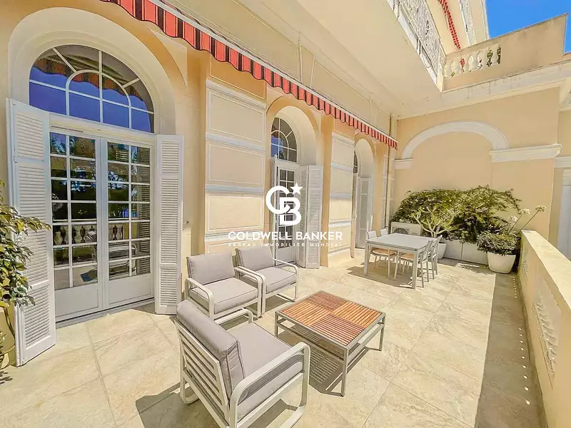 La pièce de réception dotée d'une très belle hauteur sous plafond et de 3 grandes portes fenêtre offre un accès direct à la terrasse de 35 m² depuis laquelle vous pourrez admirer un tableau où se mêlent le vert de la végétation et le bleu de la méditerranée.