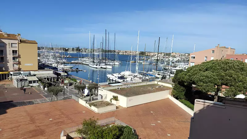 LE CAP D'AGDE : Vue imprenable! Situé proche port et plage du Môle à pied, STUDIO+ LOGGIA meublé.. Comprenant: Entrée, salle d'eau avec wc, kitchenette sur séjour, loggia avec volet roulant électrique, belle vue dégagée ..côté port...SUD... 4e étage sans ascenseur... Climatisation réversible. Charges de copropriété 721€/an, copropriété de 121 lots. ( Honoraires agence inclus charge vendeur). Energie: DPE C/173 et GES A/5