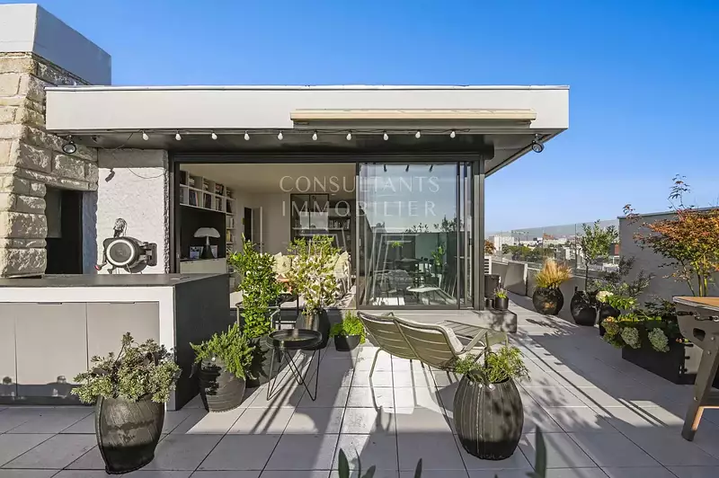 Avec sa vue époustouflante à 360° sur Paris et tout l'ouest parisien, elle est pensée comme une pièce de vie à part entière, végétalisée et aménagée avec goût. Elle dispose d'un salon d’été, d'une cuisine extérieure équipée