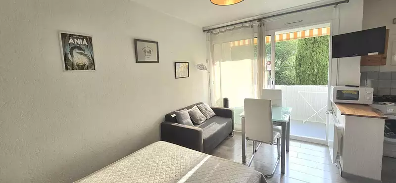 Situé au premier étage d'un immeuble en copropriété, ce bien se compose d'une pièce de vie lumineuse avec coin cuisine aménagé, d'une salle d'eau avec WC séparé, ainsi que d'une terrasse couverte offrant une vue agréable sur le parc. Des travaux récents ont été réalisés sur la toiture et les façades, améliorant l'isolation thermique du bâtiment.