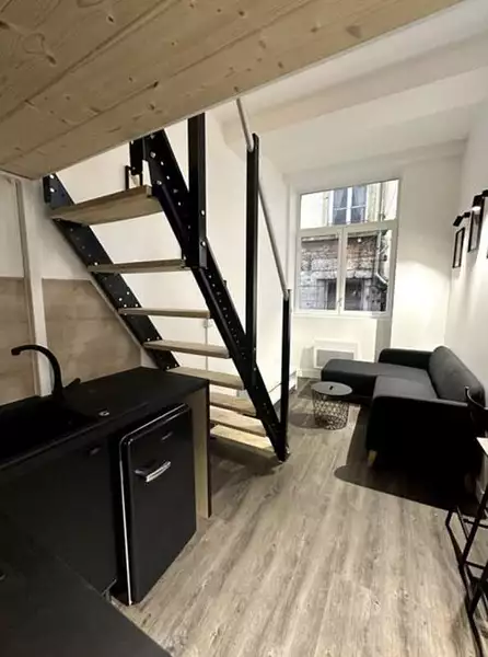 L'appartement se compose d'un coin salon très cosy, d'une petite cuisine entièrement équipée et aménagée, d'une salle de bain refaite à neuf et d'un coin nuit en mezzanine, pratique et confortable.