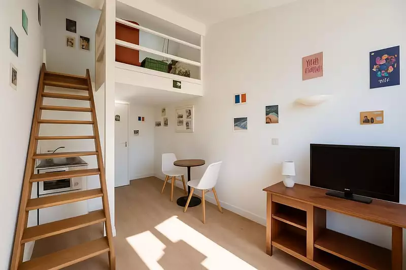 Dès l'entrée, on perçoit un espace optimisé : la pièce principale allie lumière naturelle et volume pensé pour accueillir un coin nuit en mezzanine.