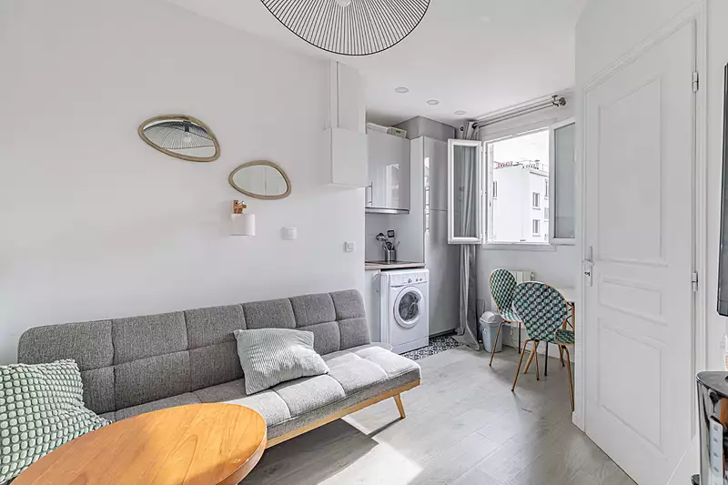 Idéal pour un investissement locatif ou un pied-à-terre parisien, ce 2 pièces de 17,28 m² se situe au 7ème et dernier étage d'un immeuble ancien de très bon standing, au calme, lumineux et avec vue dégagée. Il se compose d'une pièce de vie avec cuisine, d'un coin nuit et d'une salle d'eau avec WC. A deux pas des commerces et des transports, il bénéficie d'un emplacement extrêmement recherché. DPE en cours (6.40 % honoraires TTC à la charge de l'acquéreur.)