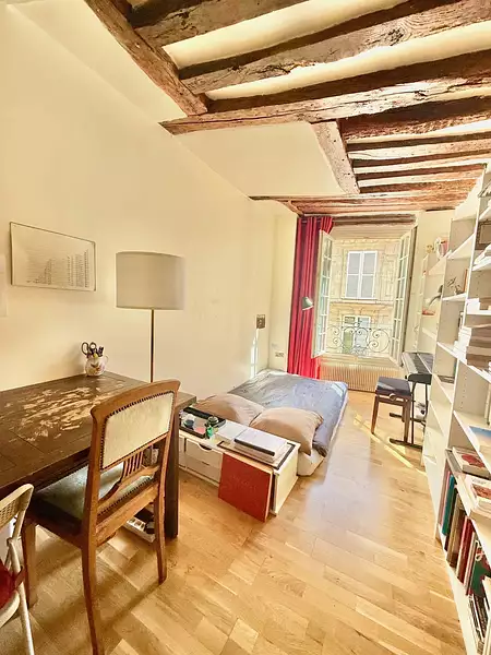 Idéalement situé à deux pas de la place des Vosges, au 4e étage d'une charmante copropriété du 18e siècle, Studio parfaitement aménagé se composant d'une entrée, une pièce à vivre, une cuisine ouverte équipée, une salle de douche avec wc. Belle hauteur sous plafond, poutres apparentes, double vitrage, parquet, chauffage collectif au gaz. Idéal premier achat ou pied à terre parisien.