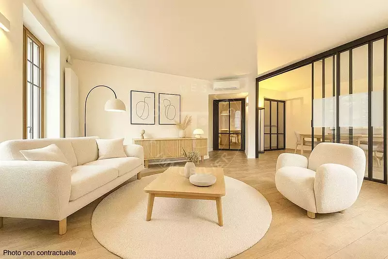 Mais au-delà de l’usage professionnel, c’est surtout le potentiel de transformation en un appartement familial d’exception qui fait de ce bien une opportunité rare. Un double séjour, une cuisine avec verrière, quatre chambres, un bureau, une salle à manger et une terrasse au calme sont facilement envisageables, comme le montrent les visuels d’aménagement virtuel réalisés à partir des volumes existants. L’ambiance y devient chaleureuse, contemporaine, sans dénaturer le charme classique de l’immeuble.