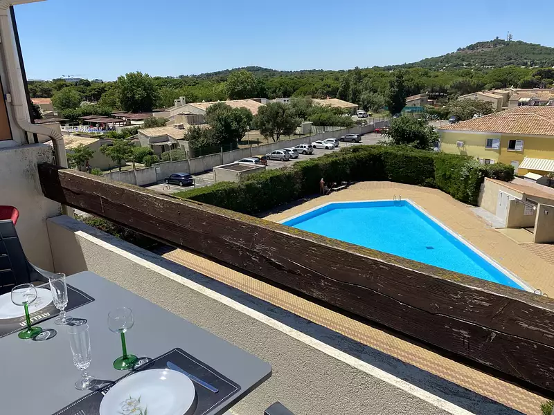 Dans une résidence au calme bien entretenue avec piscine, au 4eme étage et dernier du bâtiment avec ascenseur, joli studio de 18m² + sa terrasse de 5m² comprenant un séjour lumineux avec grand lit , un coin cuisine équipé, une salle d'eau, de grands placard de rangements, et une terrasse avec magnifique vue dégagée.