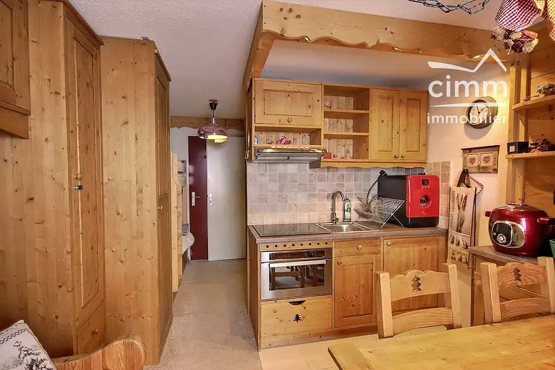 Le séjour de 12 m² est baigné de lumière grâce à ses ouvertures en bois, offrant une vue imprenable sur les montagnes. La cuisine équipée vous permettra de préparer vos repas avec facilité, tandis que la salle de bains et les WC indépendants assurent votre confort.