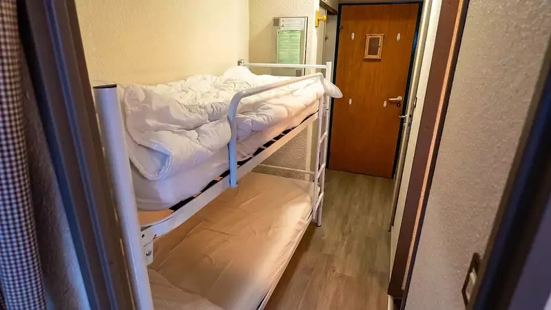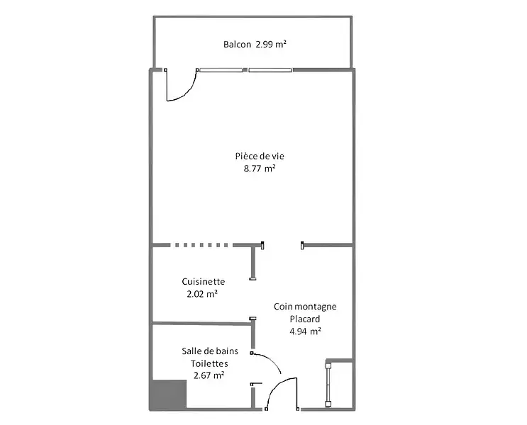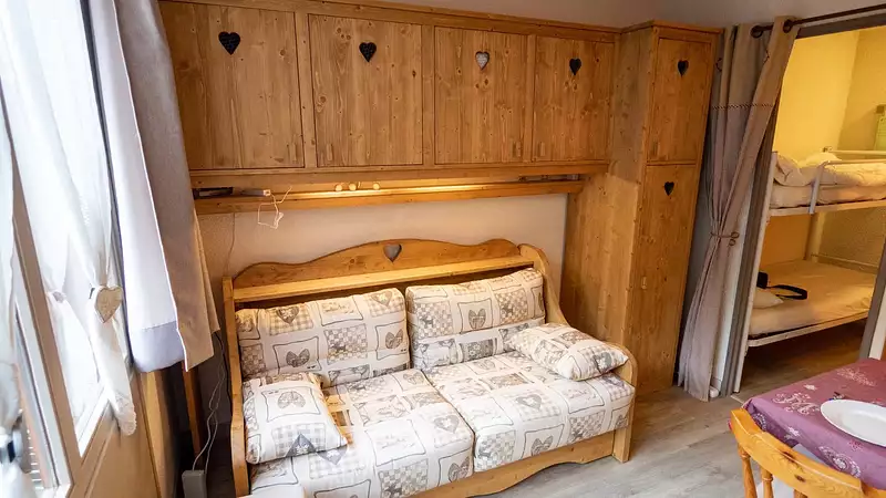 Entrée (2 couchages superposés), placard,  kitchenette, salle d'eau + wc, séjour (canapé 2 couchages) et balcon (Ouest).