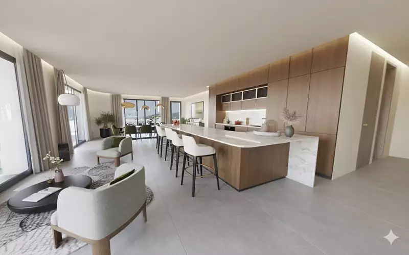 Situé au dernier étage, cet appartement T4 offre 196,69 m² habitables ainsi qu’une terrasse de 139,37 m². L’entrée mène à un vaste séjour de 97,32 m², baigné de lumière et ouvert sur une terrasse triple exposition Nord, Ouest et Sud, offrant une vue entièrement dégagée. La cuisine ouverte s’accompagne d’un cellier attenant.