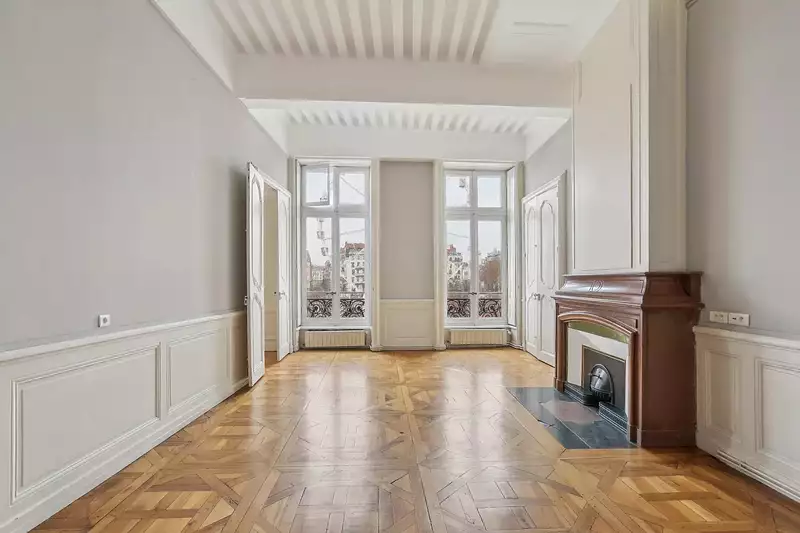 Au 2ᵉ étage d’un immeuble élégant, cet appartement lumineux de 198.36 m² offre une vue dégagée et tout le charme de l’ancien : parquets Versailles en excellent état, cheminées dans les trois pièces principales, hauteurs sous plafond généreuses, boiseries raffinées et plafonds à la française et à caissons.