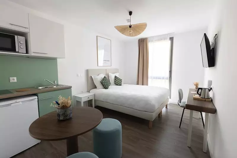 Appartement type studio situé au R+1 du bâtiment 1, comprenant un séjour/cuisine et une salle d'eau avec water-closet.
