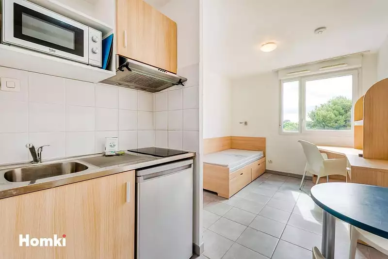 Au 1er étage avec ascenseur, studio meublé de 19 m², lumineux dans une résidence étudiante avec gardien et services de Montpellier, quartier Saint-Eloi.
