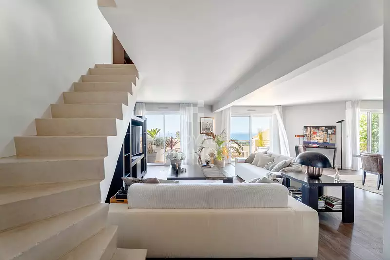 Situé au dernier étage avec ascenseur d’une résidence soignée, ce T5 Duplex de près de 200 m2 habitables (155 m2 Carrez) offre une ambiance paisible, des volumes ouverts, et une terrasse avec vue mer à couper le souffle.