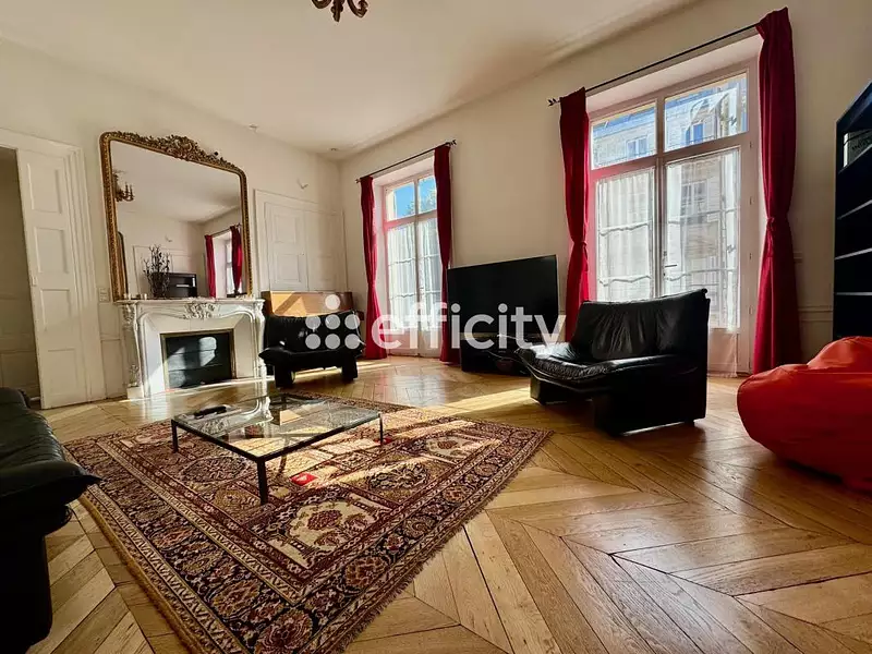 L'appartement se compose d'un spacieux salon tranversant, lumineux avec de grandes fenètres, miroirs murales, d'une grande cuisine dinatoire équipée de 28m², avec un balcon filant de la cuisine au séjour, offrant une vue imprenable sur la place Franz-Liszt et sur l'église saint Vincent de Paul.