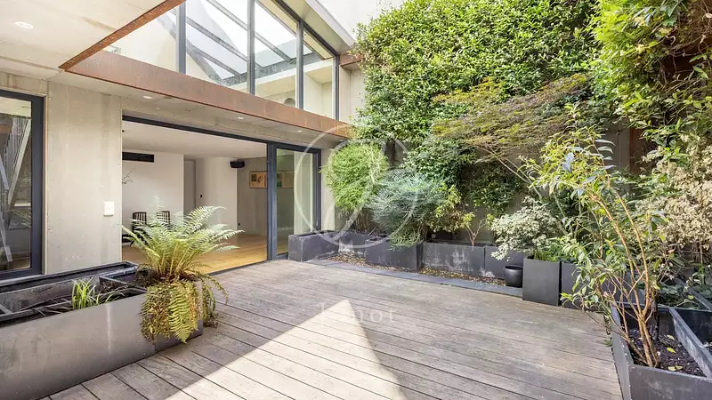 Le premier niveau s’ouvre sur une galerie d’entrée menant à une grande suite parentale de 38,85m² avec salle de douche et dressing ainsi qu’une salle de bains indépendante et des toilettes séparées. Dans son prolongement, une vaste pièce de vie sous verrière bénéficie d’une belle hauteur sous plafond. Elle intègre une cuisine haut de gamme, aménagée et équipée, et s’ouvre sur un jardin arboré de 31,97m², à l’abri des regards, offrant un calme rare. Une mezzanine surplombant les espaces communs complète l’ensemble pouvant faire office de salon intimiste, bureau ou chambres supplémentaires.