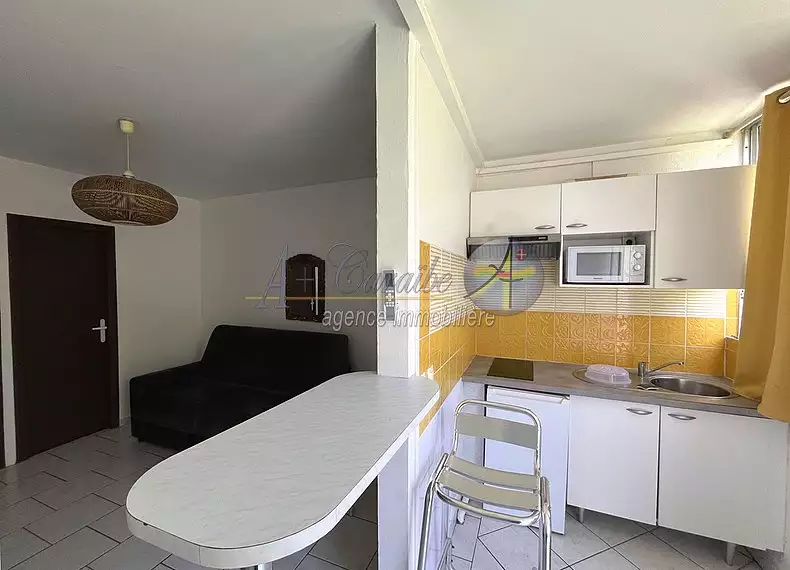 Le logement dispose à l’entrée, d’un coin cuisine très lumineux équipé et aménagé avec placards, d'une pièce principale climatisée pouvant servir à la fois de salon et de chambre, d’une salle d’eau et d’un cellier.