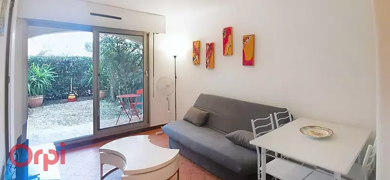 Appartement en rez de jardin composé: d'un coin cuisine, d'un séjour, d'une salle de bains avec wc et d'une terrasse de 5m² donnant sur un jardin d'environ 12m².
