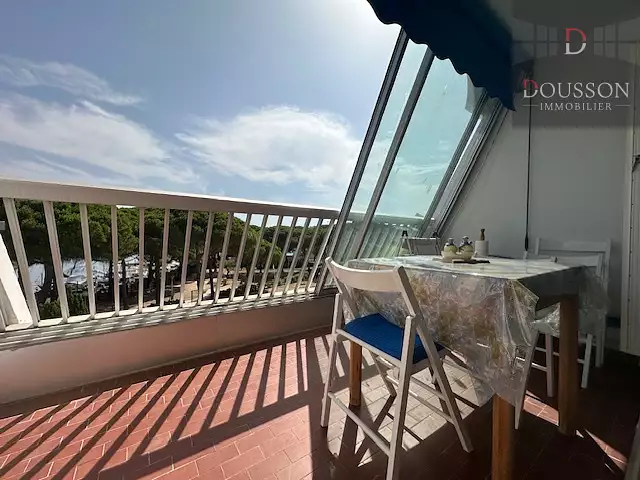 a 5 min à pied de la plage et des commerces, dans une copropriété fermé et sécurisé, faible charge, au deuxième et dernier étage avec une vue magnifique sur les jardin et le port , agréable studio cabine composé d'une entrée avec cabine 2 lits superposés , une salle d'eau et wc avec machine a laver, une kitchenette, un canapé BZ avec meuble, une terrasse loggia fermé d'environ 7 m2 (espace de vie supplémentairei), store neuf, volet roulant, vendu meublé avec son parking privatif, et cave.