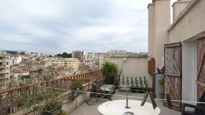 13003, Place Bernard Cadenat T1 au 9ème et dernier étage ouvert sur une grande et belle terrasse de 27 m2 avec vue panoramique. Vendu avec locataire en place, bail non meublé du 02/07/2018, loué 416.68 + 70 € de charges. Prévoir travaux.