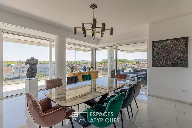 Situé dans un secteur prisé à proximité immédiate de toutes les commodités, ce bien d'exception développe une surface de 220 m². Au sommet d'une résidence récente et ultra sécurisée à l'architecture contemporaine, il s'accompagne d'une terrasse courant le long de l'ensemble des pièces et d'un spectaculaire toit-terrasse de 230 m². Doté d'une cuisine d'été, d'un jacuzzi, de deux pergolas et d'un espace vert piscinable, ce dernier offre une vue imprenable sur Metz et les hauteurs de Scy-Chazelles. Trois garages et trois places de stationnement complètent cette propriété rare. Les matériaux haut de gamme, la géothermie, la climatisation réversible et l'ascenseur privatif participent à son confort exceptionnel. L'appartement, bénéficiant d'une hauteur sous plafond notable et entièrement insonorisé, se compose de quatre suites indépendantes, chacune avec sa propre salle d'eau et un dressing intégré, garantissant praticité et intimité. Le vaste salon, baigné de lumière naturelle grâce à de larges baies vitrées, s'ouvre sur une cuisine ouverte, entièrement équipée et aménagée avec des matériaux haut de gamme. La salle à manger attenante crée une belle fluidité entre les espaces. Un bureau permet de bénéficier d'un espace de travail calme et fonctionnel. Une buanderie-cellier ainsi qu'une remarquable cave à vin climatisée complètent cet agencement soigné. La domotique intégrale assure une gestion optimisée de l'ensemble des équipements, renforçant le confort au quotidien. Chaque pièce de l'appartement s'ouvre sur la terrasse périphérique de 105 m², offrant une sensation constante d'ouverture sur l'extérieur. Le toit-terrasse, accessible par un ascenseur privatif, constitue un véritable lieu de vie à ciel ouvert. Conçu comme un espace de détente et de réception, il se distingue par son jacuzzi intégré, ses deux pergolas, sa cuisine d'été et son jardin paysager, aisément piscinable. Ce belvédère végétalisé surplombe Metz et la vallée de la Moselle, offrant un panorama unique, en toutes saisons. Le tout s'inscrit dans un environnement résidentiel de qualité, proche des écoles, des commerces, des transports en commun et des principaux axes routiers, facilitant l'organisation de la vie quotidienne. A la croisée du confort moderne et de l'architecture haut de gamme, cet appartement incarne un mode de vie rare dans un cadre privilégié. Une opportunité immobilière singulière, unique dans le secteur messin. Commerces à 7 min à pied Ecoles publiques à 7 min à pied et privées à 10 min en voiture Transport en commun en face de la résidence Accès autoroute à 8 minutes en voiture CLASSE ENERGIE : A / CLASSE CLIMAT : A Montant moyen estimé des dépenses annuelles d'énergie pour un usage standard, établi à partir des prix moyens des énergies indexés sur les années 2021, 2022, 2023 (abonnements compris) : entre 1150 et 1620 euros Contact : Chloé 06.47.86.10.73 Copropriété de 10 lots (Pas de procédure en cours). Charges annuelles : 5997 euros. Chloé RICHARD (EI) Agent Commercial - Numéro RSAC : 983254921 - Metz.