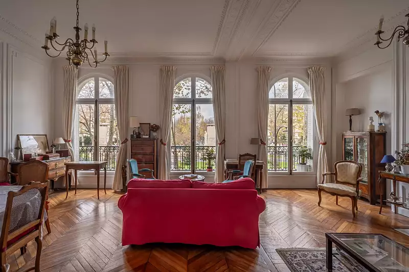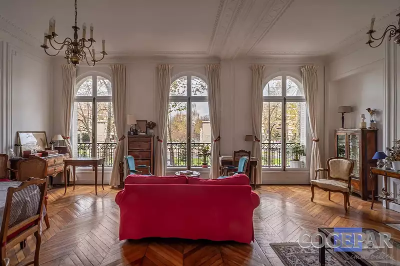 Seul sur son beau palier, sa galerie d'entrée de 18 m2 distribue une enfilade de salons lumineux (plus de 80 m2) contemplant la verdure de la place et, au loin, la perspective du boulevard d'Inkermann.