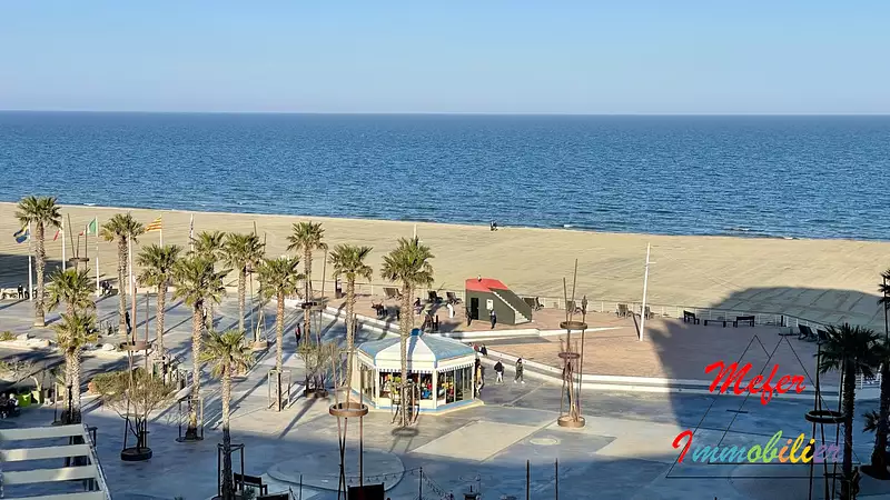 Dans une résidence avec piscine et accès direct a la plage par promenade piétonne, très bel appartement quatre couchages, clé en mains avec une belle décoration moderne, Il comprend une entrée avec cabine, une salle d'eau wc, une pièce principale avec cuisine équipée donnant sur une belle terrasse vue mer.
