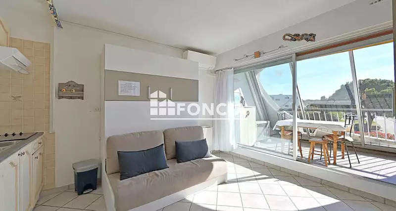 Dans une résidence avec piscine, studio cabine au pied de la plage, petite vue mer latérale. Il est en très bon état. Exposition EST.
