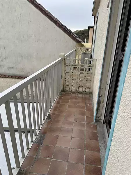 Appartement à 20m de la plage, comprenant : un séjour avec cuisine ouverte donnant accès à un balcon, une chambre, une salle de douche et un toilette.
