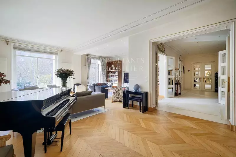 CONSULTANTS IMMOBILIER : PARIS XVI - AVENUE GEORGES MANDEL. VASTE APPARTEMENT PLEIN SUD AVEC BALCON. Au premier étage d'un immeuble de haut standing 1903 en pierre de taille, avec gardien : Appartement d'une superficie de 240 m2 à fois de réception et familial bénéficiant d'une hauteur sous plafond de 3,30 m d'un balcon exposé sud, vue sur la tour Eiffel.