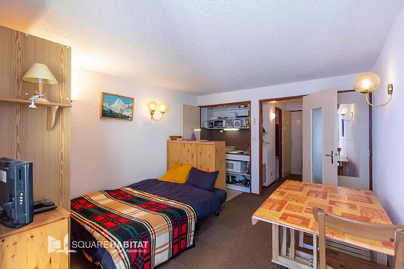 En exclusivité - Dans une petite résidence fraichement rénovée avec une isolation par l'extérieure, avec une sortie directe sur les pistes! Venez découvrir un agréable STUDIO, proposant une entrée avec un coin nuit, une salle de bains avec w.c, une kitchenette, une séjour avec rangement donnant à un balcon en exposition EST avec une vue sur la montagne et la vallée ! Parfait pour être au calme. Le plus : Jouissance d'un Stationnement intérieur.