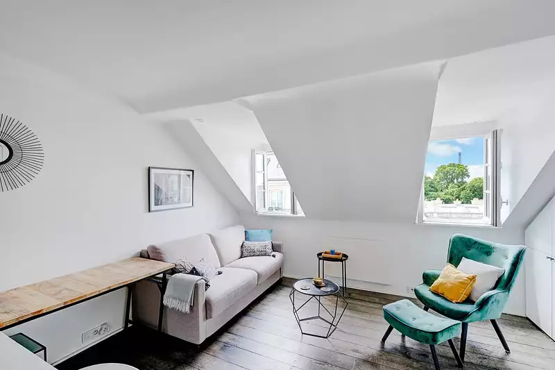 Face au Palais de l’Élysée, se trouve un charmant studio, niché au cinquième étage, accessible par ascenseur.