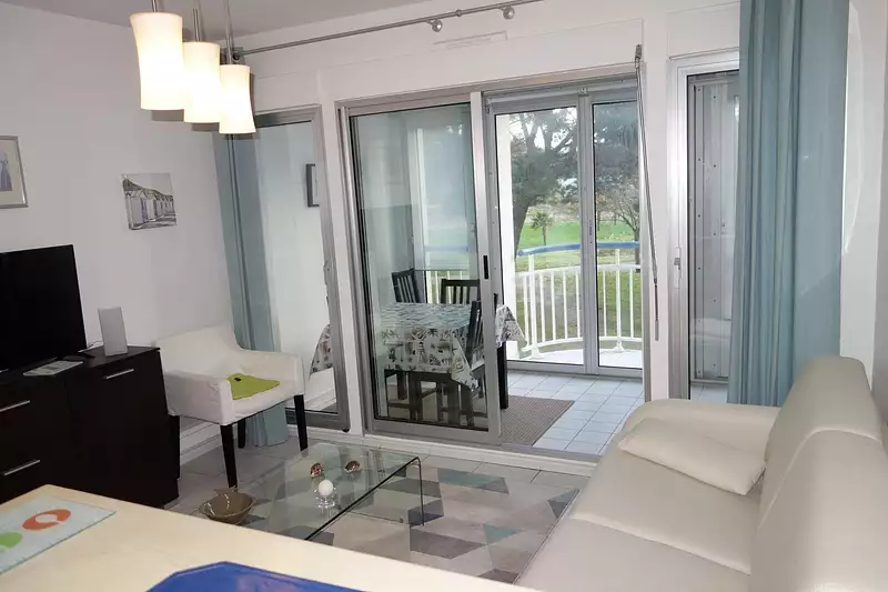 L'appartement se compose d'une entrée avec cabine, idéale pour accueillir 2 lits superposés. Le séjour lumineux s'ouvre sur un balcon fermé, créant un espace supplémentaire pour profiter de l'air marin. La cuisine est aménagée et équipée avec évier, plaques, lave-vaisselle, et des placards fonctionnels. La salle de bains, les toilettes et les placards ajoutent à la praticité de cet espace.