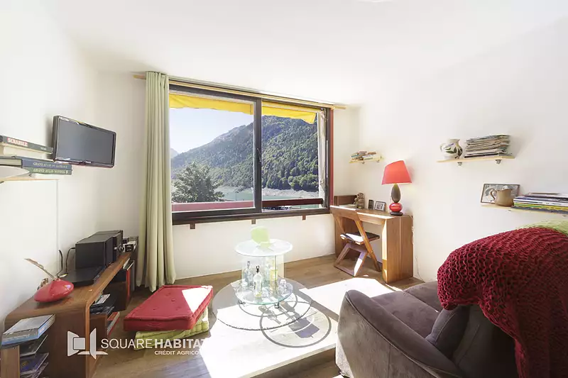 Station de ski Artouste. Appartement d'environ 24 m² habitable, type studio - 4-5 couchages - entièrement refait. Composé d'une entrée avec lits superposés, une pièce de séjour avec cuisine ouverte. Une salle d'eau avec WC. Séjour équipé d'un lit escamotable. Grande baie vitrée illuminant l'appartement et lui offrant une vue sur le lac de Fabrèges et les montagnes environnantes. Lots annexes: un casier à skis et une place de parking couverte dans la résidence voisine.