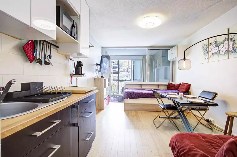 Il vous propose une salle de bains, une chambre séparée et un coin cuisine/séjour.