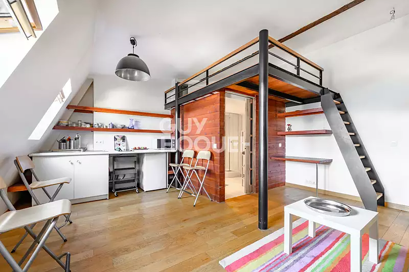 Guy Hoquet Saint-Georges vous présente en exclusivité un très beau studio avec un espace nuit en mezzanine idéalement situé rue La Bruyère, au coeur de la Nouvelle Athènes, entre Trinité et la Place Saint-Georges. Sur cour et d'une surface de 32.67 m² au sol (22.09m² Carrez), il se trouve au 6ème et dernier étage par ascenseur jusqu'au 5ème dans une belle copropriété de 1850 bien entretenue (ravalement rue réalisé en 2024). En très bon état, il bénéficie de beaux volumes avec sa hauteur sous plafond de 3.10m, d'un calme absolu, d'une vue dégagée et d'une belle luminosité avec son exposition Est. Son plan comprend une confortable pièce de vie avec une cuisine ouverte, un espace pour les repas et une salle de douche avec de vrais toilettes. Le coin nuit, en mezzanine basse, crée une ambiance cocooning et optimise l'espace de vie. Appartement très bien isolé: DPE C ! Racks à vélos dans la cour (4.92 % honoraires TTC à la charge de l'acquéreur.) Copropriété de 43 lots - dont 7 lots habitation. (Pas de procédure en cours). Charges annuelles : 1369 euros.